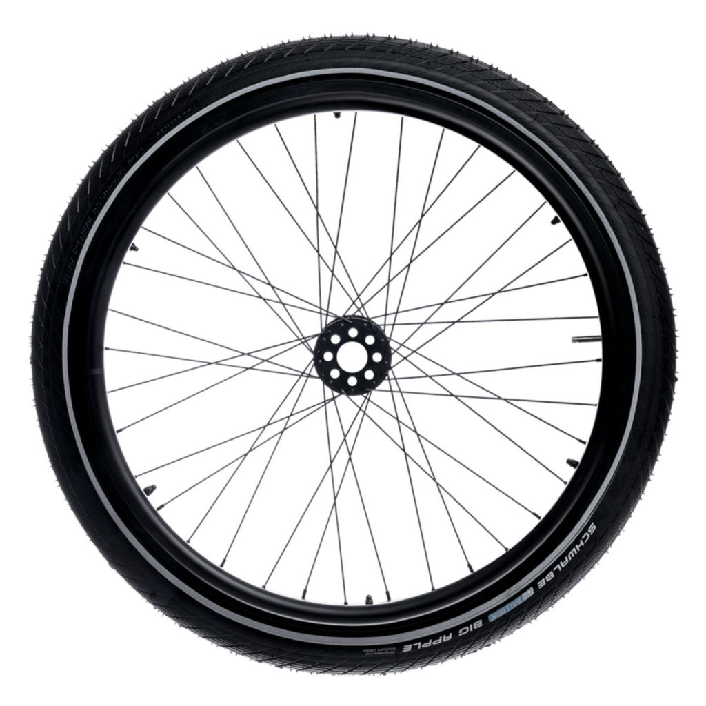 The Omobic Buddy is fitted with Schwalbe Big Apple tyres offering a large contact area making this wheel ideal for soft moveable terrain like sand, grass and even gravel. The tyre has a smooth tread which offers a reasonably high rolling resistance when propelling.